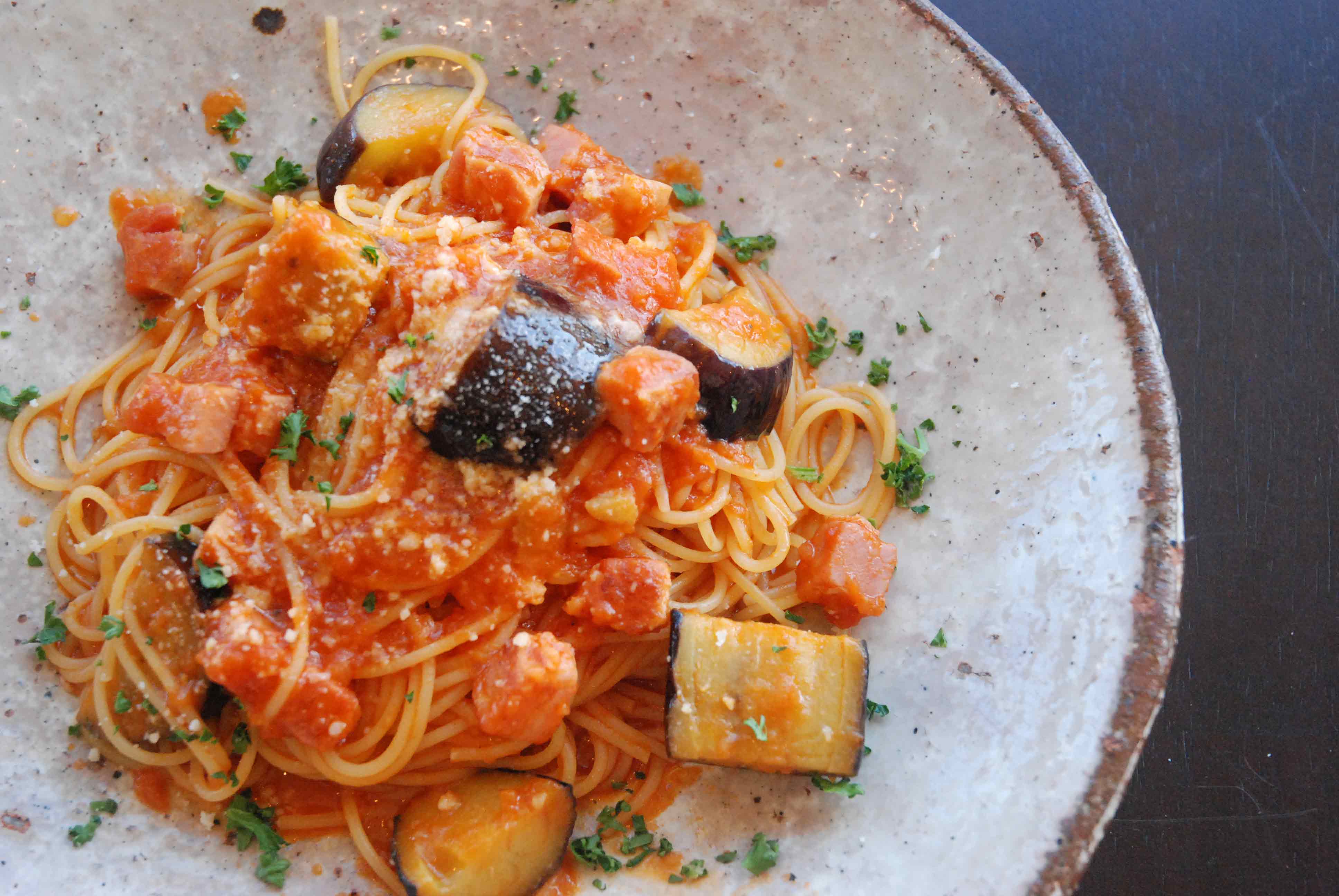 トマトと相性抜群の茄子と厚切りベーコンを合わせたパスタです。