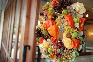 春に作ってもらったリースの土台を再利用しての秋バージョンです。