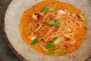タコとアスパラのトマトクリームソースです。