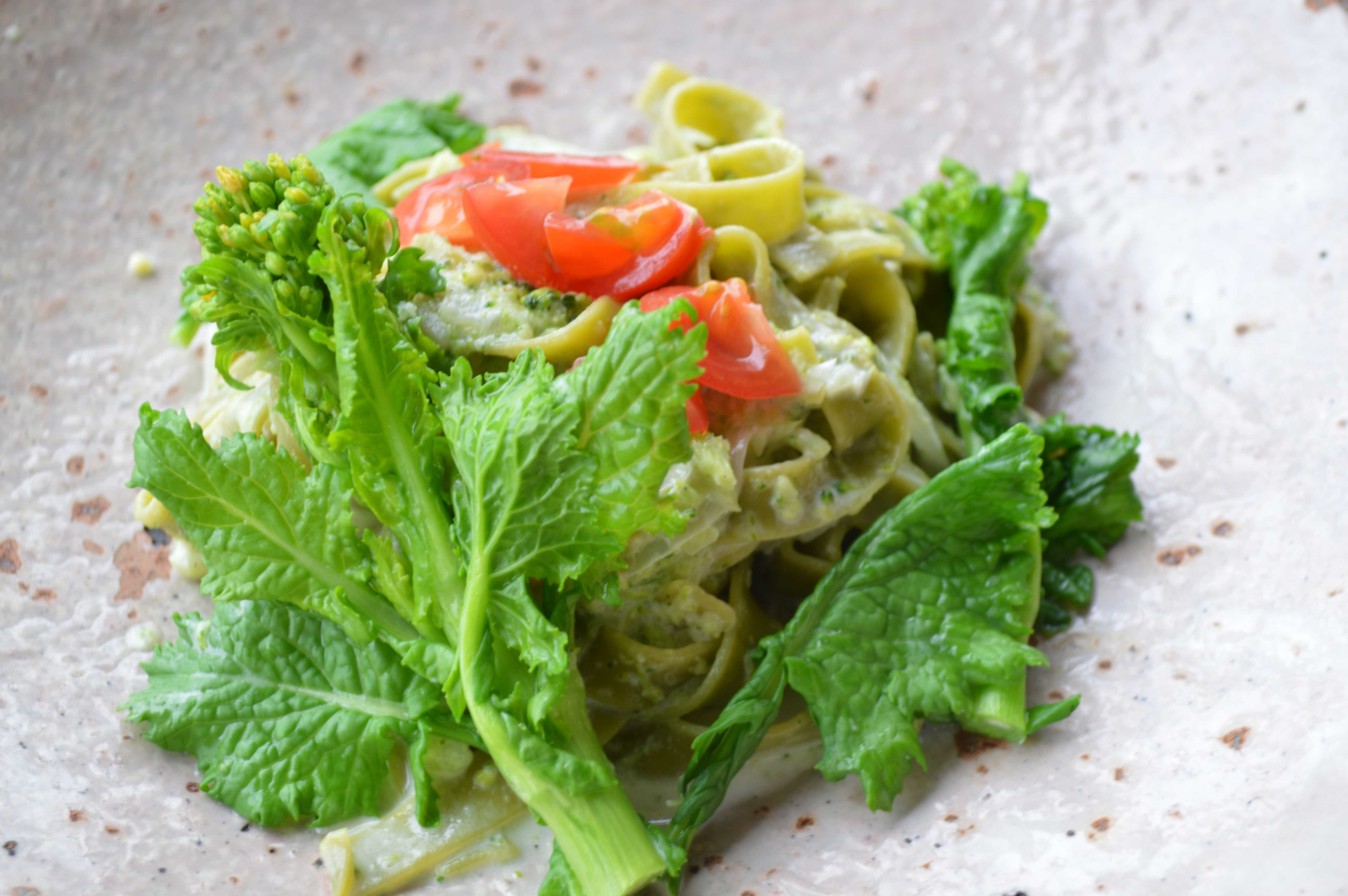 菜の花のほろ苦さとプチトマトの酸味がマッチ。ほうれん草のフェトチーネのグリーンが春らしい彩りきれいなパスタです。
