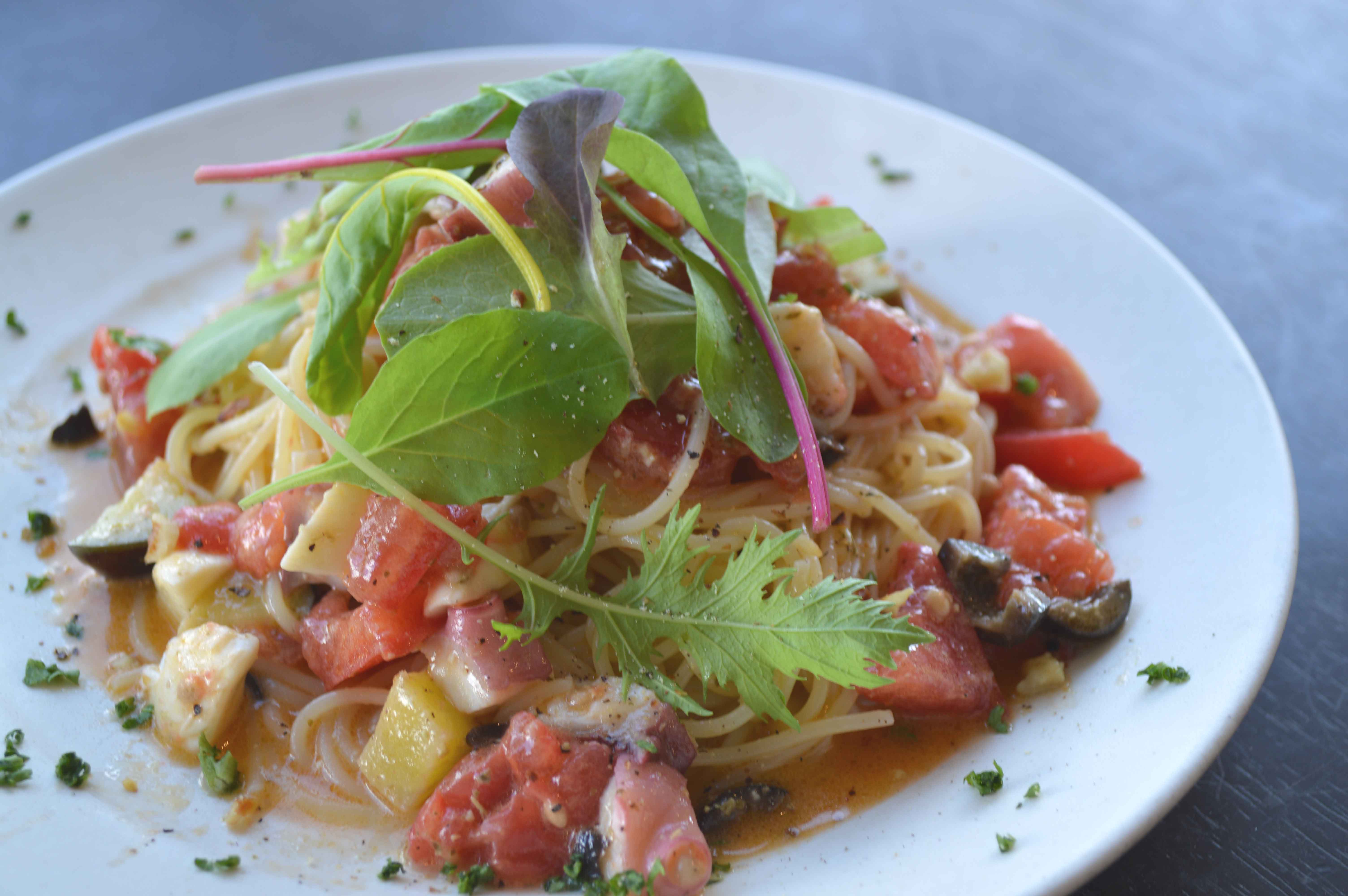 「タコと赤茄子とモッツァレラのフレッシュトマト冷製パスタ」