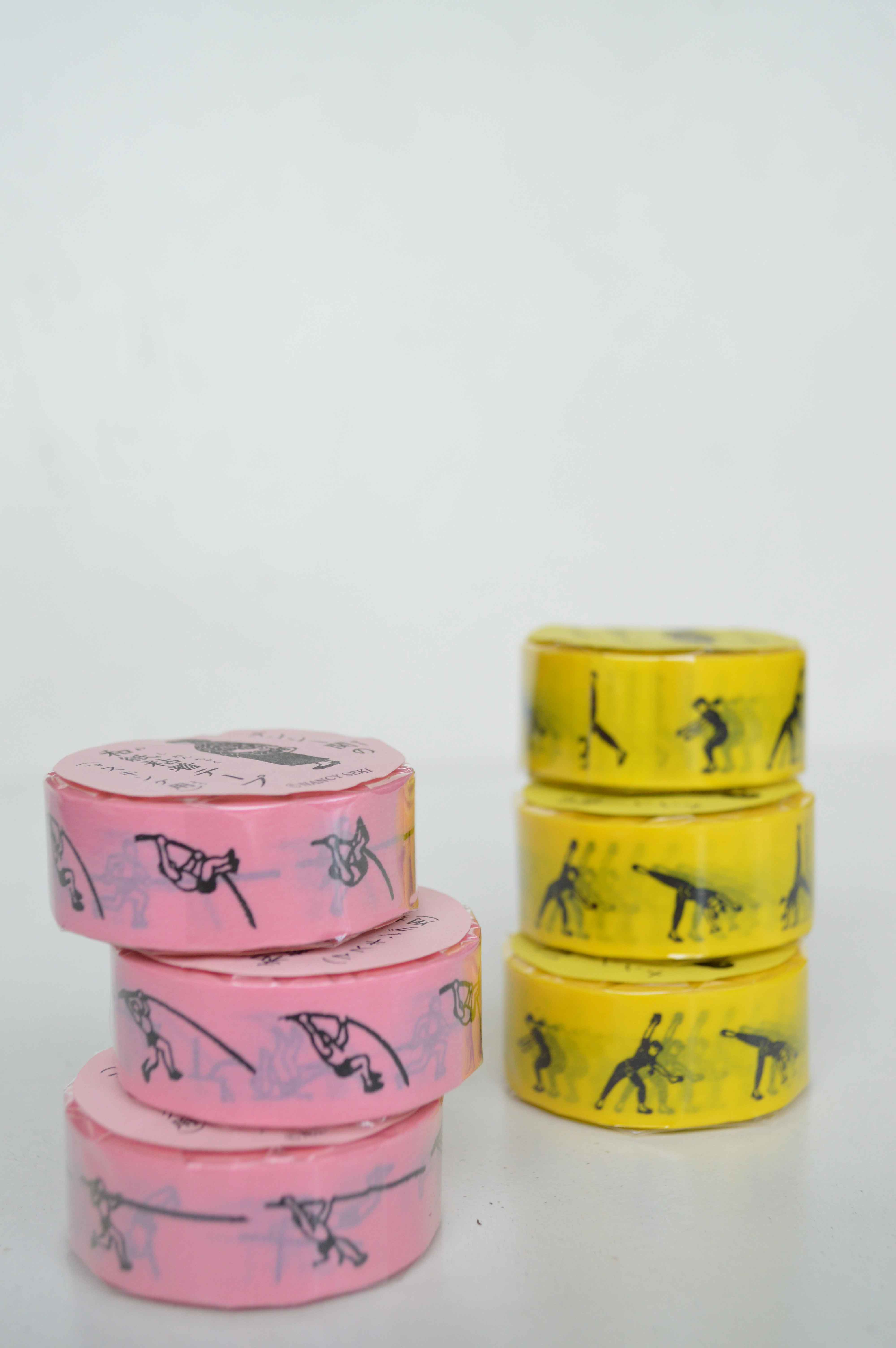 マスキングテープ 側転イエロー・棒高跳びピンク 各221yen。