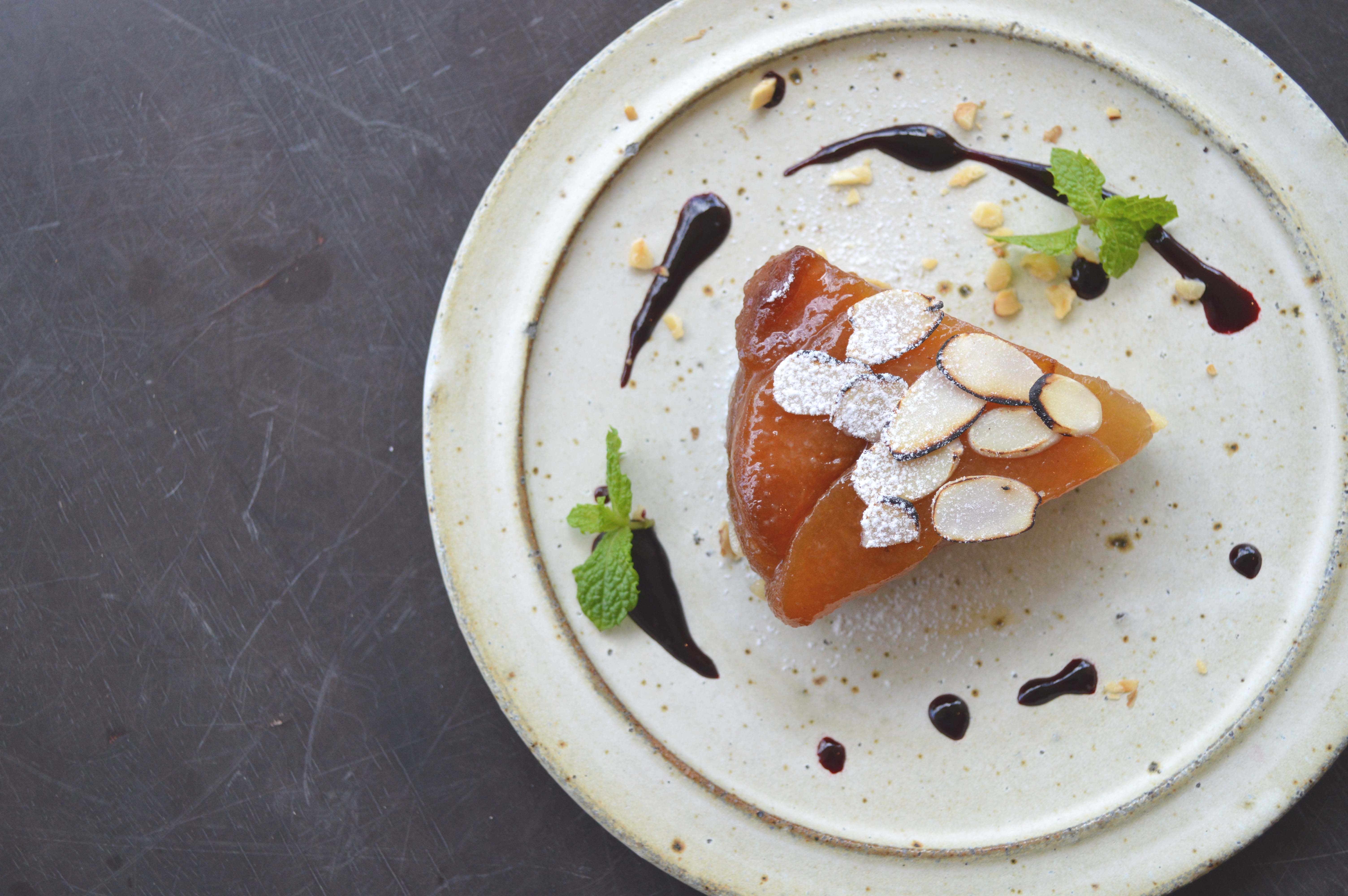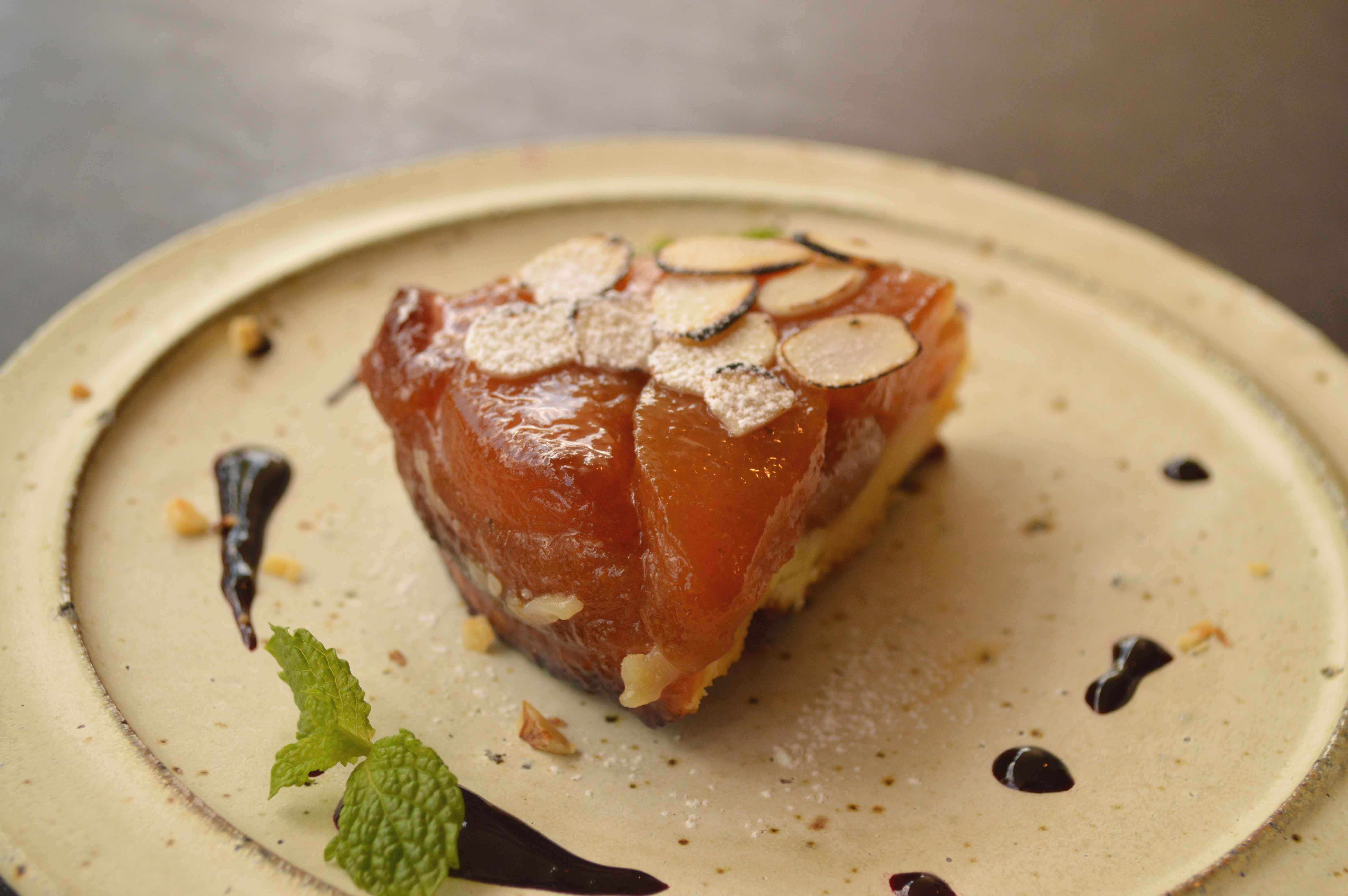 「梨のタルトタタン カシスソース添え」です。