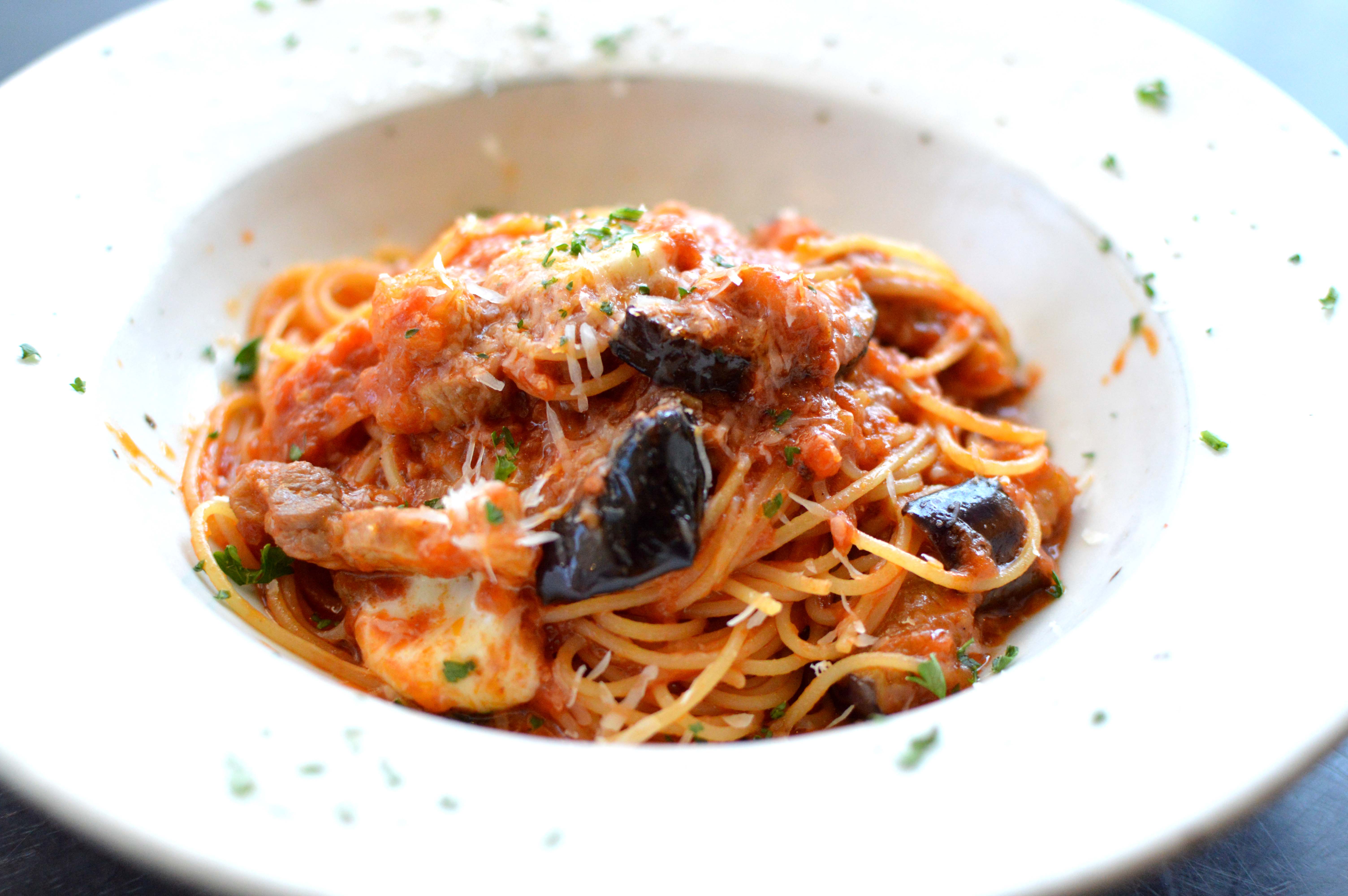 自家製パンチェッタとナスとモッツアレラのトマトソースです。